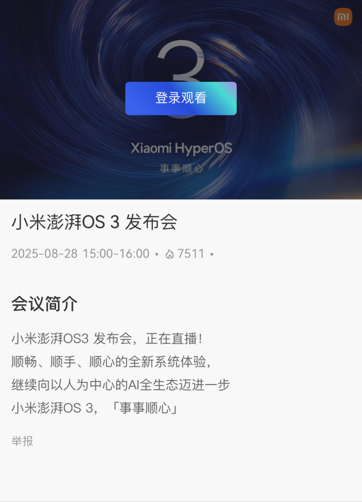 小米新一代自研操作系统——澎湃 Hyper OS 3 的发布会日期疑似曝光。据悉现在还有实盘配资吗,新品发布会预计将于2025年8月28日15:00正式举行,slogan 定为「事事顺心」,预示着该系统将在智慧体验与流畅感知方面带来全新突破。