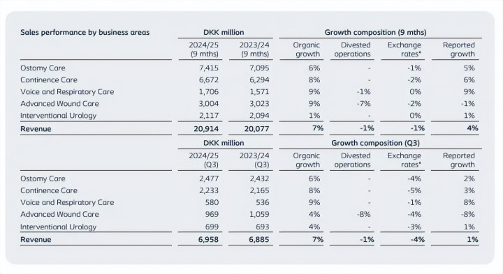 Lars Rasmussen 对此表示:“我们第三季度的业绩符合预期,实现了 7% 的有机增长和 28% 的息税前利润率,维持了 2024/25 财年的财务指引。第三季度的业绩得益于慢性护理业务的广泛增长,抵消了中国市场的挑战。”