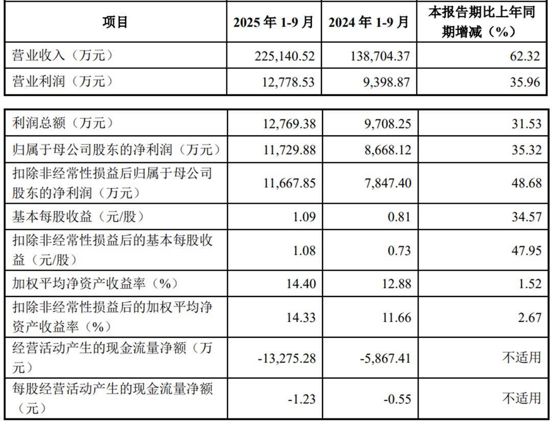 2025年1-9月,丰倍生物的营业收入为 225,140.52 万元,同比增长 62.32%;归属于母公司股东的净利润为11,729.88万元,同比增长 35.32%;扣除非经常性损益后归属于母公司股东的净利润为11,667.85万元,同比增长 48.68%;经营活动产生的现金流量净额为-13,275.28 万元,上年同期为-5,867.41万元。